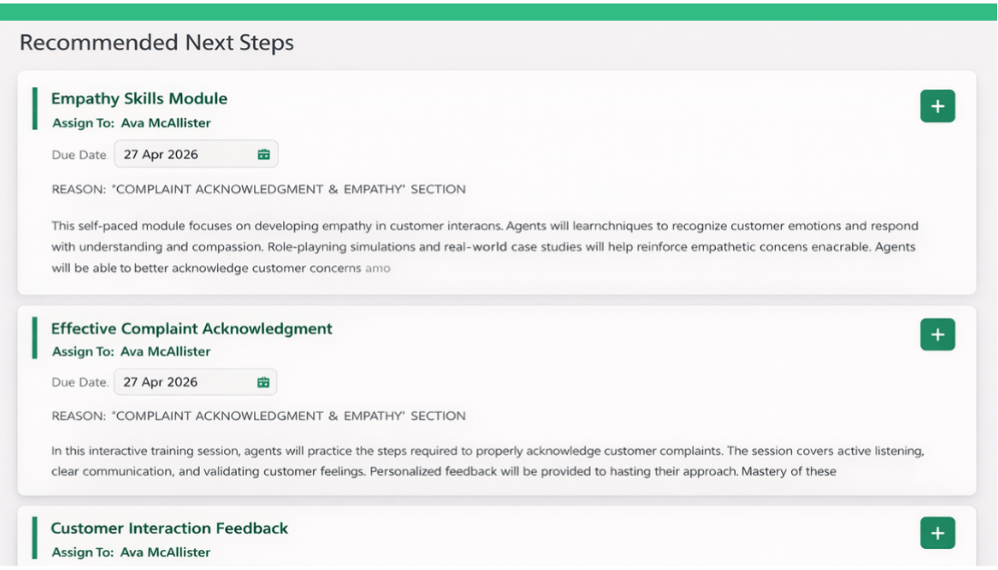 With Leaptree Optimize, QA insights automatically translate into targeted recommended learnings for agents. Based on real interaction data, the platform identifies specific skill gaps, risks, and performance issues.
