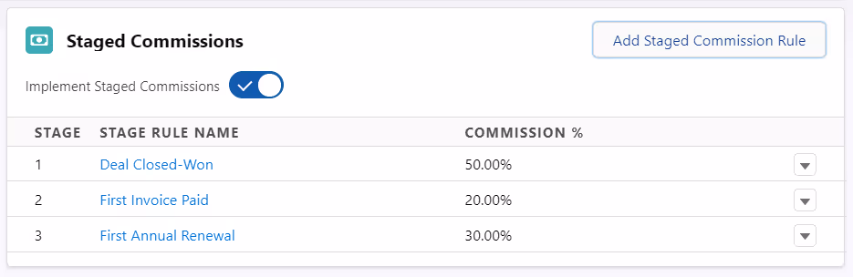 For example, a rep could earn fifty percent of their commission rate when a deal is signed. After that, they'll earn an additional twenty percent based on the customer paying their first invoice, and the remaining thirty percent when the customer renews after twelve months.